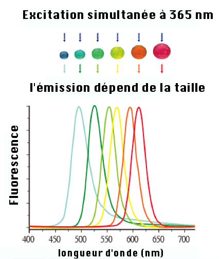La luminescence de nanoparticules est utilisée comme marqueur en biologie depuis longtemps. À l’usage, un colorant organique lorsqu’il reçoit la lumière, est excité, puis il se désexcite en renvoyant une longueur d'onde. Après plusieurs cycles de ce type, il finit par s’oxyder, se dégrader. Une nanoparticule ne subit pas ce type de dégradation et représente alors un fluorophore beaucoup plus stable dans le temps. Les puissances d'émission peuvent aussi être plus élevées. De plus, comme la longueur d’onde d’émission est réglable avec la taille, on peut avoir plusieurs nanoparticules de différentes couleurs qui émettent en même temps en étant excitées toutes avec une seule longueur d’onde (en général ces nanoparticules absorbent toujours dans l’ultraviolet). Il est donc possible de faire une image en couleur permettant de visualiser plusieurs types de fluorophores. Cela permet en outre de faire un multi-marquage, particulièrement précieux pour la biologie, pour imager, par exemple, différentes parties d’un tissu simultanément marqué avec des nanoparticules de différentes couleurs.