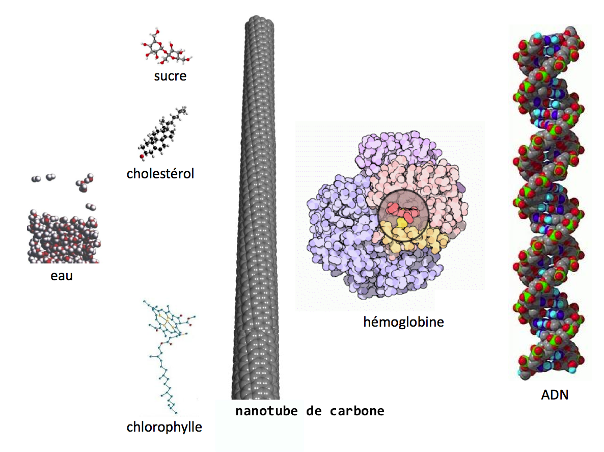 Dans notre quotidien, on rencontre, par exemple, la molécule d’eau ou encore la molécule de saccharose (celle qui nous sert à sucrer le café) qui sont des objets d'un peu moins de 1 nm. On trouve des molécules un peu plus grandes comme le vert de la chlorophylle ou le rouge de l’hémoglobine qui mesurent déjà 1 nm dans leur largeur. Ce sont des molécules et elles sont déjà nanométriques. Ensuite, il y a des objets que l’on connaît bien comme l’ADN ou d’autres fibres à l’intérieur de notre corps qui font plusieurs microns selon la longueur mais seulement quelques nanomètres de diamètre. Ce sont typiquement des objets nanométriques que l’on avait du mal à étudier avant l’avènement des nanosciences.