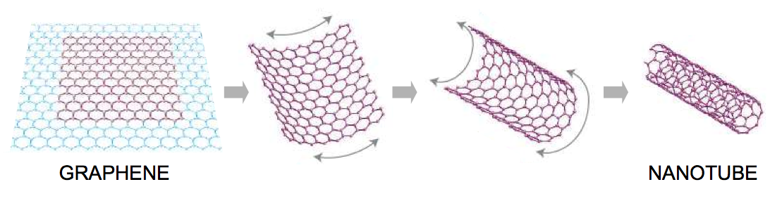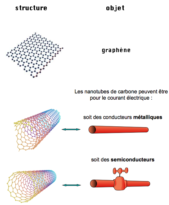 Les nanotubes de carbone recouvrent plusieurs classes d’objets. Ils sont constitués d’un film de carbone organisé sous forme d’hexagones qu’on appelle nids d’abeille (figure 7). Dans la structure du graphite ces plans de carbone sont superposés les uns sur les autres. Lorsqu’on les isole afin d'obtenir un seul film, cela s'appelle du graphène.
