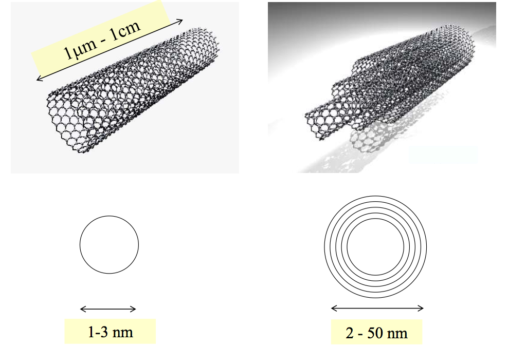 Dans les nanotubes de carbone ces plans poussent directement sous forme de tubes. On peut avoir soit des plans uniques, qui en général font entre 1 à 3 nm, soit plusieurs couches concentriques refermées en un tube (nanotube multiparois). Les épaisseurs peuvent être assez nombreuses (jusqu'à 50 épaisseurs) et les propriétés du nanotube résultent de la somme des propriétés de toutes les couches qui le constituent (figure 8).