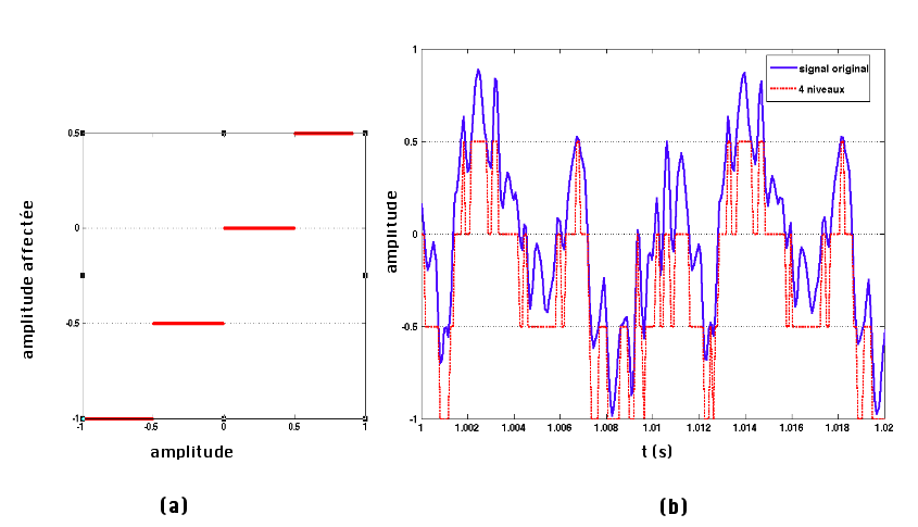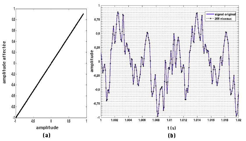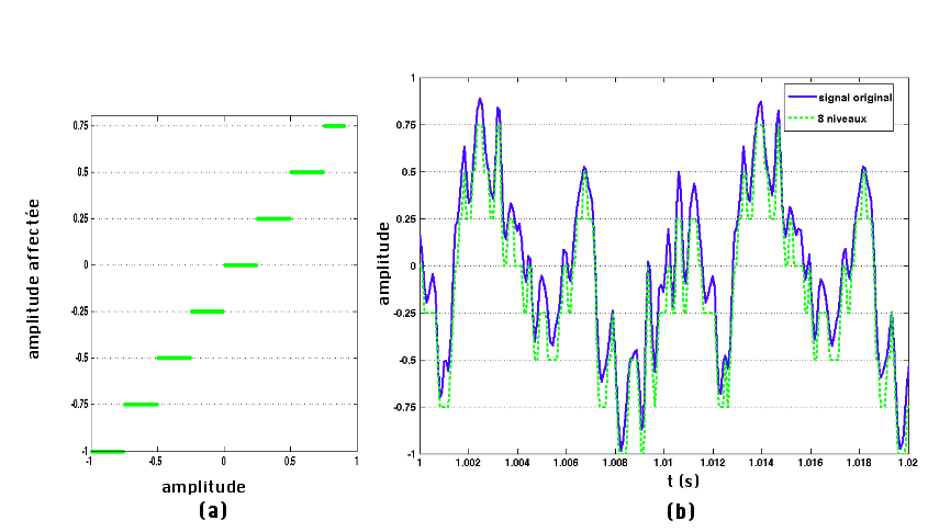 Le tableau ci-dessous permet de comparer les différents choix de résolution. Dans la partie située à gauche (a), le nombre de niveaux de quantification est présenté sous la forme d'un graphique donnant la valeur affectée au signal numérisé en fonction de l'amplitude du signal original. Dans la partie droite du tableau (b), on présente la supperposition du signal original avec le signal ainsi numérisé.