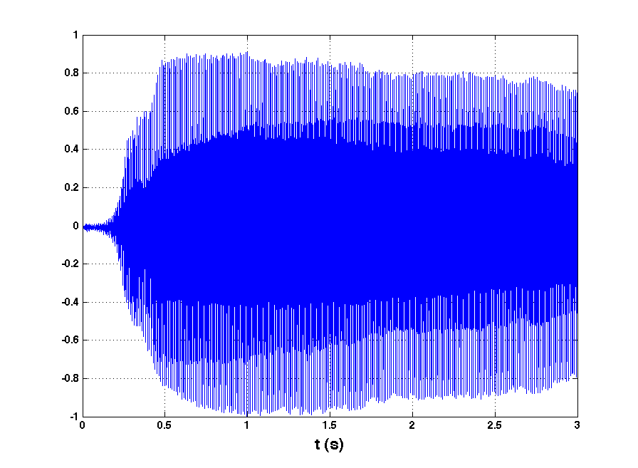 Dans cette première partie, on s'intéresse à un signal audio représentant simplement une note tenue dans le temps. C'est un fa joué à la clarinette (87,3 Hz). Ce signal a préalablement été échantillonné à une fréquence de 11 025 Hz. On va maintenant attribuer une valeur numérique à chacun de ces échantillons.