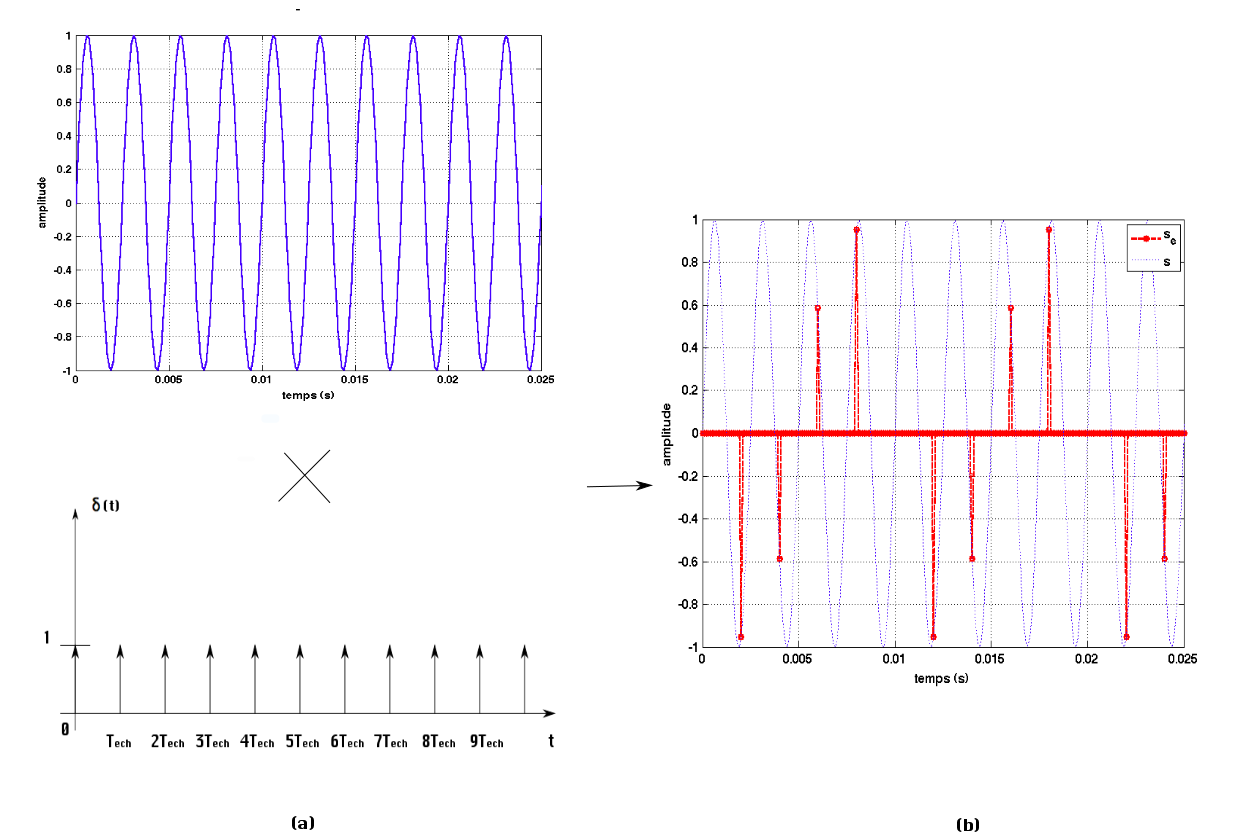Echantillonner un signal revient à prendre un certain nombre de points régulièrement espacés de ce signal. Cette fonction consiste mathématiquement à multiplier le signal original S(t) avec un signal d'amplitude 1 à chaque instant pour lequel on prend un échantillon (opération répétée à la période Tech) et d'amplitude zéro sinon. Cette fonction est appelée peigne (ou train périodique d'impulsions) de Dirac δ(t), voir figure 2 (a) en bas.