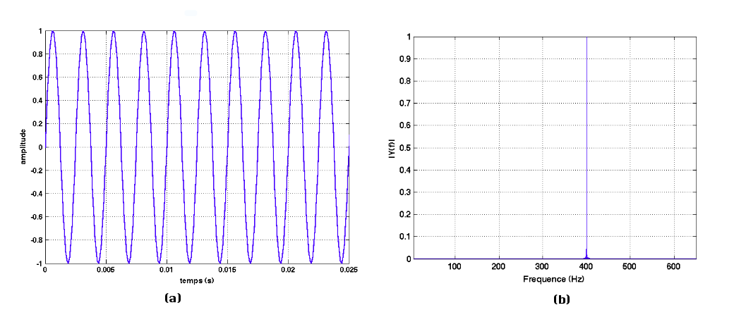 On travaille avec un signal sinusoïdal de fréquence 400 Hz, soit S(t) = sin (2 π f t), où f =400 Hz. La figure 1 donne en (a) la représentation temporelle et en (b) la représentation dans l'espace fréquentiel de S(t).