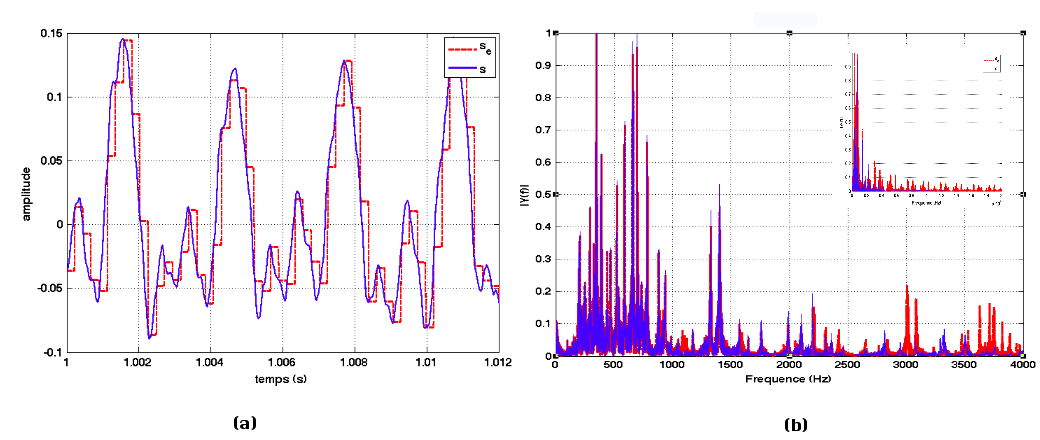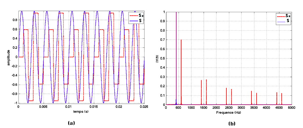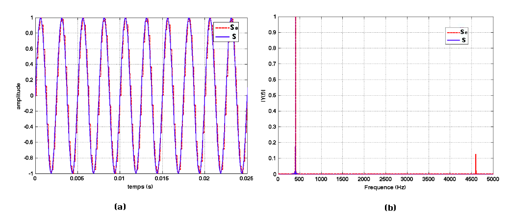 Figure 7. Signal sinusoïdal échantillonné à Fech = 5 000 Hz (a) signal temporel original S (bleu) et échantillonné Se (rouge), (b) spectres correspondants. |