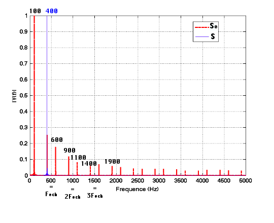 Le spectre du signal échantillonné est représenté sur la figure 3. On représente en bleu, la raie à 400 Hz du signal original S, et en rouge apparaissent les raies appartenant au signal échantillonné Se.
