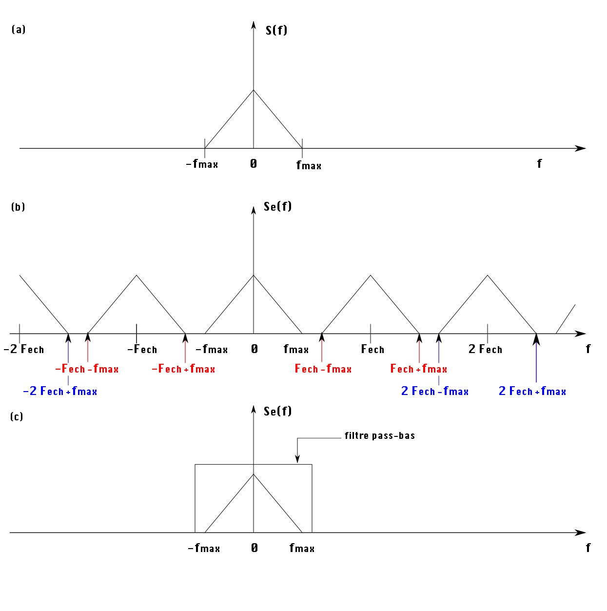 Ainsi pour retrouver le signal original, il suffit d'utiliser un filtre passe bas, dont la fréquence de coupure est choisie entre fmax et Fech-fmax, figure 4(c).