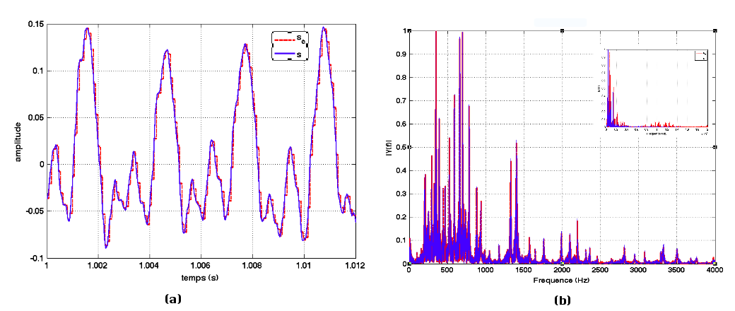Figure 9. Mélodie échantillonnée à Fech = 4 410 Hz (a) signal temporel original S (bleu) et échantillonné Se (rouge), (b) spectres correspondants. |