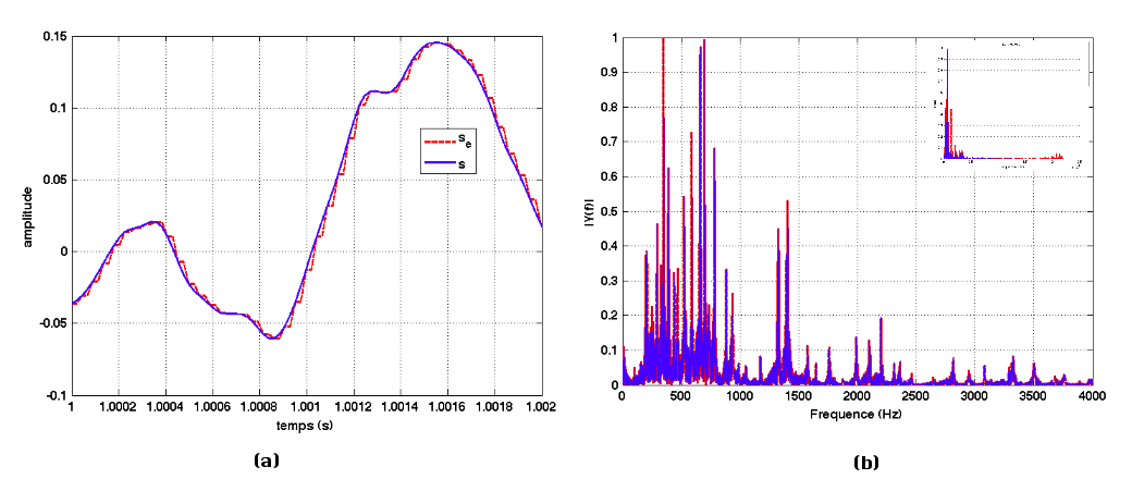 Figure 11. Signal sinusoïdal échantillonné à Fech = 22 050 Hz (a) signal temporel original S (bleu) et échantillonné Se (rouge), (b) spectres correspondants. |