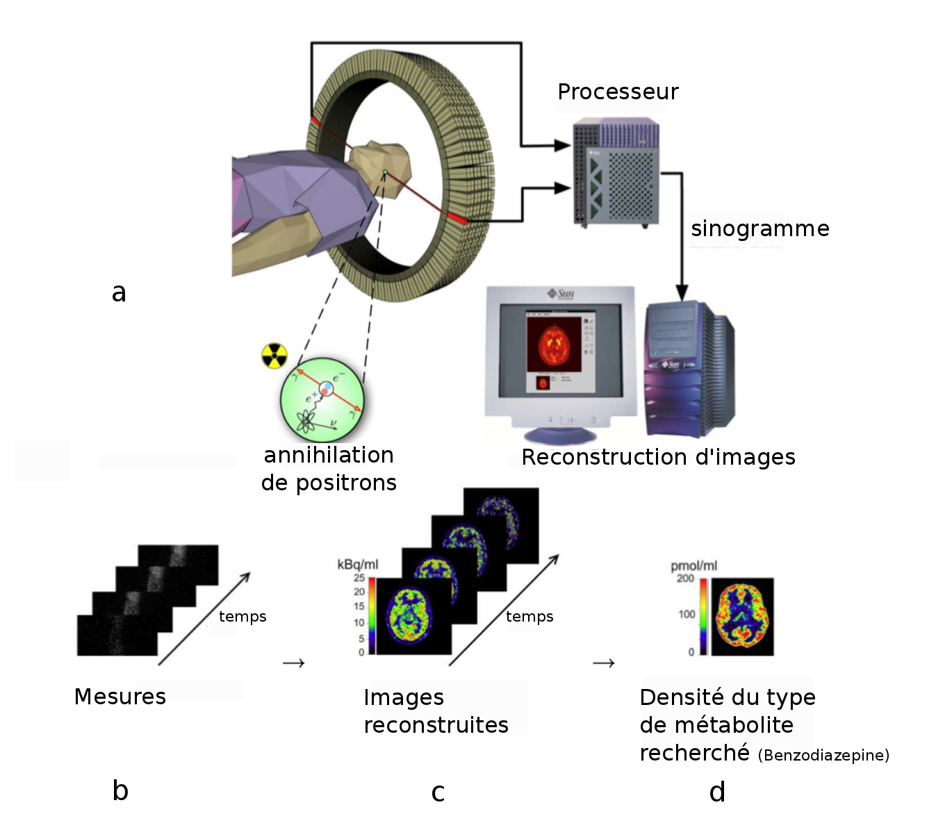 La figure 5 - a présente la technique de tomographie par émission de positrons. Les images sont obtenues en détectant les directions d'émission de photons créés par l'annihilation de positrons émis par un marqueur biologique. L'image mesurée est un sinogramme (figure 5 - b), indexé par les angles, et il faut reconstruire à chaque instant l'image 2D (ou 3D) réelle en résolvant le problème inverse de la tomographie, figure 5 - c. Finalement, la densité d'un type de métabolite dans l'organisme est obtenue en combinant les images au cours du temps, figure 5 - d.