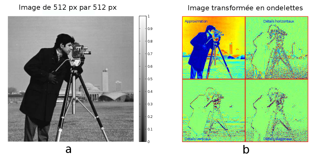 L'utilisation de la transformée en ondelettes va permettre de représenter une image initiale, donnée dans la figure 1 - a, sous la forme d'une approximation et de détails, figure 1 - b.