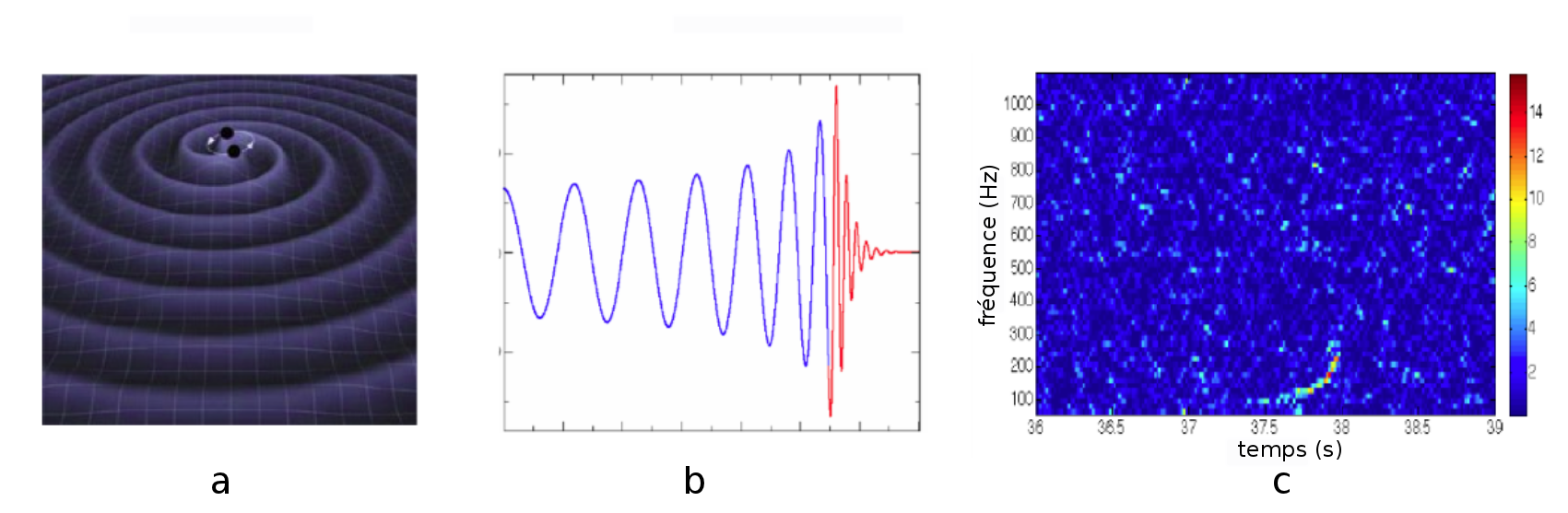 Ils se sont appuyés sur des méthodes temps-fréquence pour détecter la coalescence d’étoiles binaires. Les ondes gravitationnelles n'ont encore jamais été observées. Les prédictions théoriques, qui remontent à la théorie de la relativité générale d'Einstein, proposent que si deux étoiles tournent l’une autour de l’autre très rapidement dans la phase de coalescence (figure 4 - a), c’est à dire quand l’une va rentrer dans l’autre, le système, en tournant de plus en plus rapidement, va émettre une onde à une fréquence qui va augmenter dans le temps, figure 4 - b.