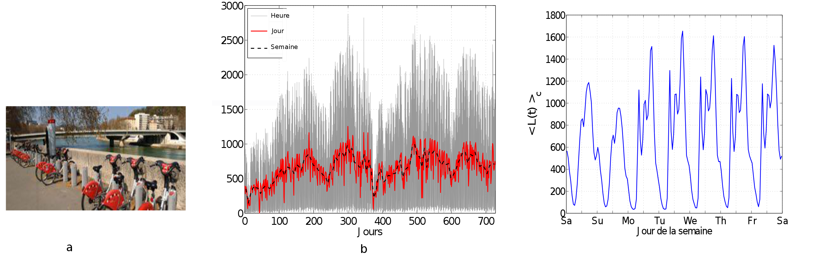 La figure 6 - b présente l'évolution du nombre de locations horaires par heure (gris), jour (rouge) ou semaine (noir) sur les 2 premières années de fonctionnement du Vélo'v. De ce signal temporel on en déduit un modèle de profil moyen de locations horaires (figure 6 - c).