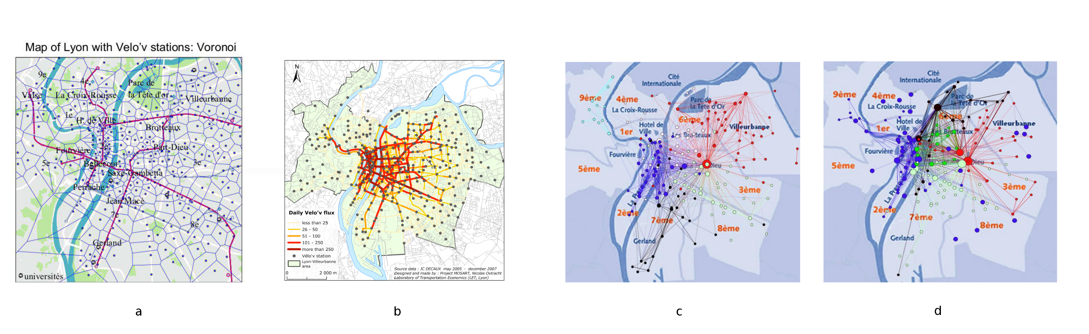 On peut mener une étude spatiale et temporelle de la dynamique des mouvements en Vélo'v. Sur la figure 7 - b, on a inféré quels étaient les flux moyens de Vélo'v dans les différentes rues de Lyon. Sur les figures 7 c et d, on représente sous forme de réseau les connections entre stations Vélo'v les lundis matins (c) et samedi après-midi (d); les couleurs indiquent des groupes de stations voyant beaucoup de trajets en Vélo'v entre elles à ce moment de la semaine. On peut constater un mode d'utilisation différent le samedi, où par exemple apparaît un groupe des stations du Parc de la Tête d'Or qui connecte aussi toutes les stations suivant les berges du Rhône et celles près de l'Hôtel de Ville. Ces cartes sont obtenues en utilisant des outils d'analyses de réseaux dynamiques venues du traitement du signal.