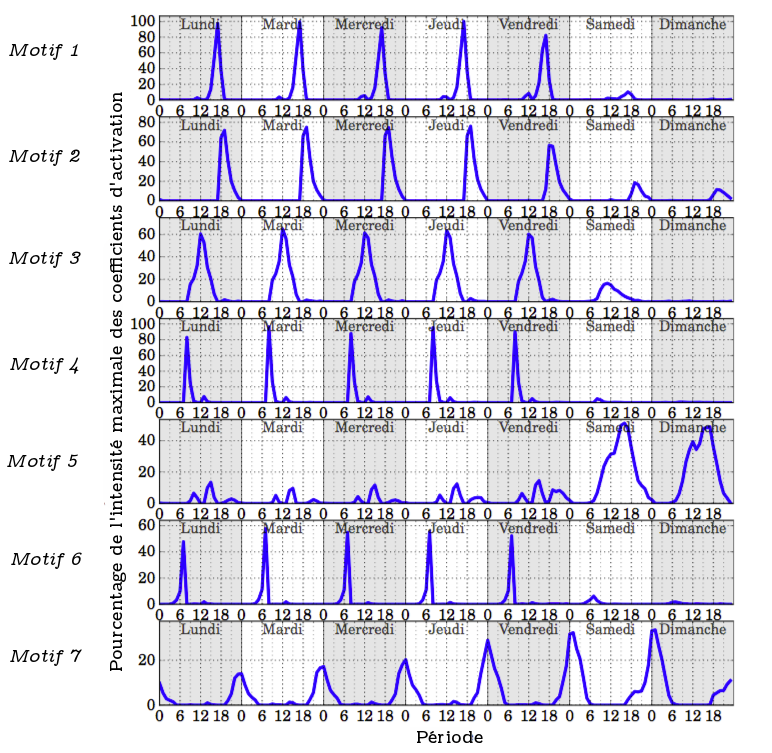 La figure 8 affiche pour chacun des motifs les coefficients d'activation pour chaque intervalle au cours de la semaine. Les pics d'intensité permettent de classer les motifs suivant deux critères : la période de la journée (matin, midi, après-midi, soirée et nuit) et le type de jour (jour de semaine ou week-end).