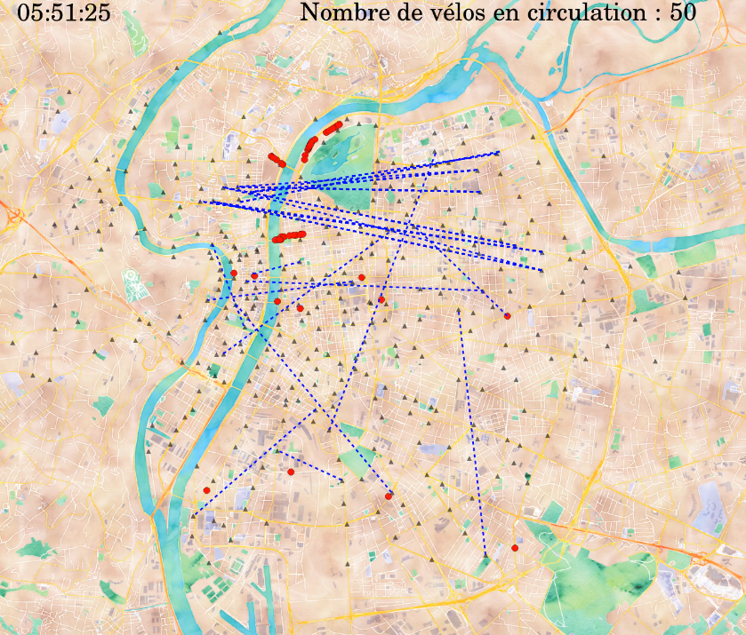 L'animation, figure 7, présente l'évolution du réseau temporel d'utilisation des vélos entre 5h00 et 9h00, le matin un jour de semaine. Les points rouges représentent les vélos et leur parcourt potentiel, les traits bleus relient deux noeuds en communication, c'est-à-dire un noeud (une station) où le vélo est emprunté et un noeud (une autre station) où ce même vélo est rendu.