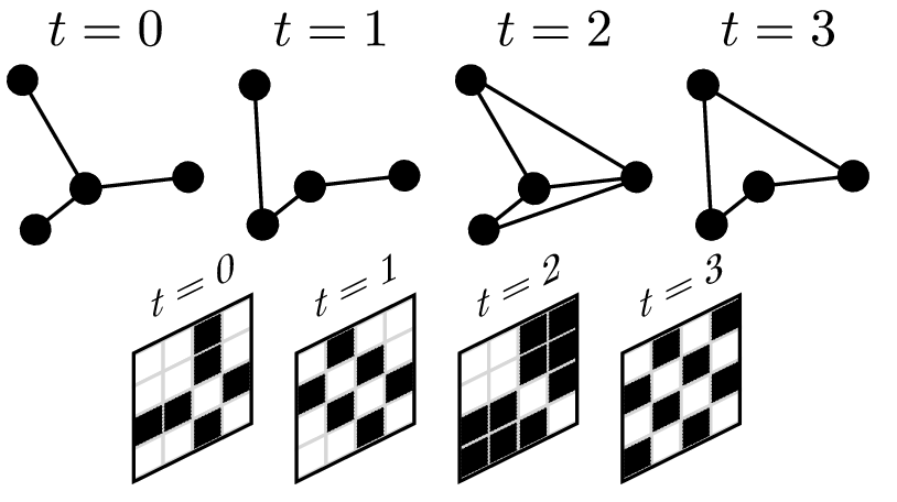 La Figure 6 résume schématiquement un réseau temporel à 4 noeuds sous la forme d’une séquence de graphes et d’un tenseur d’adjacence correspondant.