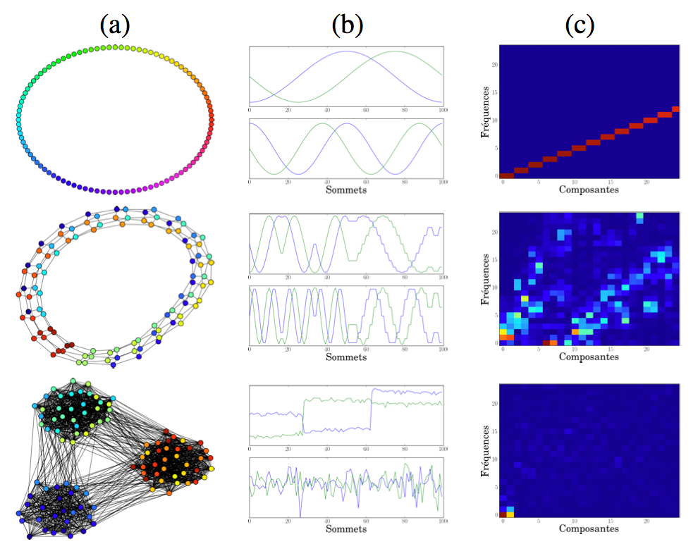 La figure 5 propose trois exemples de graphes de 100 noeuds. Pour chaque exemple, la colonne (a) présente un aperçu du graphe, la colonne (b) affiche les quatre premières composantes de la collection de signaux obtenue après transformation. On remarque que la présence de régularité dans le graphe se traduit par des sinusoïdes alors que la présence de communautés donne des signaux avec des paliers correspondants aux communautés du graphe. La colonne (c) représente l’énergie de chaque fréquence pour chaque composante.