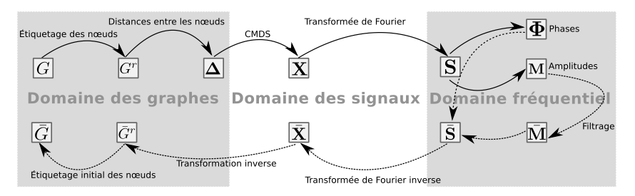 Une méthode de transformation de réseaux en signaux a été proposée (figure 4), basée sur une technique classique de statistique, le positionnement multidimensionnel classique (ou classical multidimensionel scaling (CMDS) en anglais) : les noeuds du graphe sont représentés comme un ensemble de points dans un espace euclidien, dans lequel les relations entre les noeuds sont codées par les distances entre les points. Les signaux contiennent l'information complète sur la structure du graphe.
