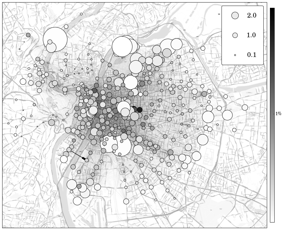 Les noeuds correspondent aux stations. La couleur des noeuds indique le degré sortant du noeud sur une échelle de blanc à noir, représentant un pourcentage de l’activité totale. La taille des noeuds indique le ratio entre degré entrant et degré sortant. Les arcs entre les noeuds sont représentés et leur épaisseur est proportionnelle au poids associé à chaque arc. Image obtenue avec Python/Numpy/Matplotlib.